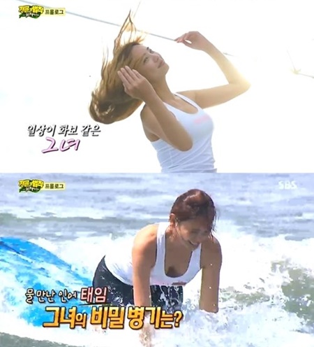 이태임은 지난 28일 밤 10시 방송된 SBS '정글의 법칙 in 코스타리카'(이하 정글의 법칙)에 출연해 다리 위에서 자기 위한 준비를 했다.