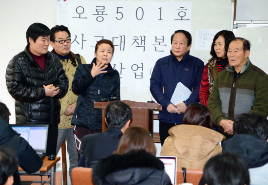 | ▲ 베링해'501 오룡호' 침몰사고 닷새째인 5일 오전 부산 서구 남부민동 사조산업 부산본부에 마련된 사고대책본부에서 사망·실종 선원 가족들이 공식입장을 밝히고 있다./뉴시스 | ||
