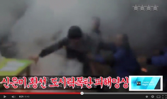 | ▲ 신은미, 황선 ‘종북’ 논란 토크콘서트의 인화물질 방화영상. 방화가 일어난 직후 현장의 모습. 방화를 저지른 오모군이 무대로 돌진하고 있다. /자료캡처. 영상출처: http://www.youtube.com/watch?v=sOuOzUBmJgw | ||
