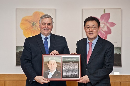 | ▲ 12일 서울 노원구 서울과학기술대에서 존 키일러 미국 피츠버그대 행정국제대학원(GSPIA) 원장(왼쪽)과 남궁근 서울과기대 총장이 기념사진을 촬영하고 있다. 남궁 총장은 이날 '2014년 GSPIA 동문상'을 수상했다. | ||
