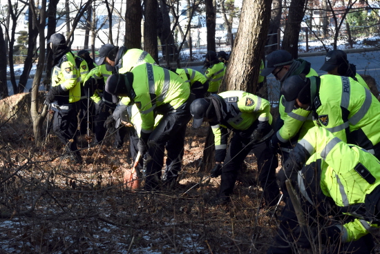 ▲ 13일 오전 경기 수원 팔달산 토막살인 사건의 피의자 박춘봉(55·중국동포)이 훼손한 시신을 유기했다고 진술한 팔달산 남쪽지역을 경찰이 수색하고 있다. /뉴시스