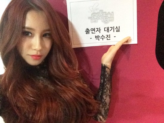 박수진은 14일 오후 자신의 인스타그램에 셀카 사진을 공개한 뒤 "무대에서 노래 할 수 있어 너무 행복한 지금~ 이곳 음악중심 대기실에 내 이름도 신기할 뿐이네요~ 빈자리 응원해줘서 너무 고마워요~♥ "라고 팬들에게 감사 인사를 전했다.