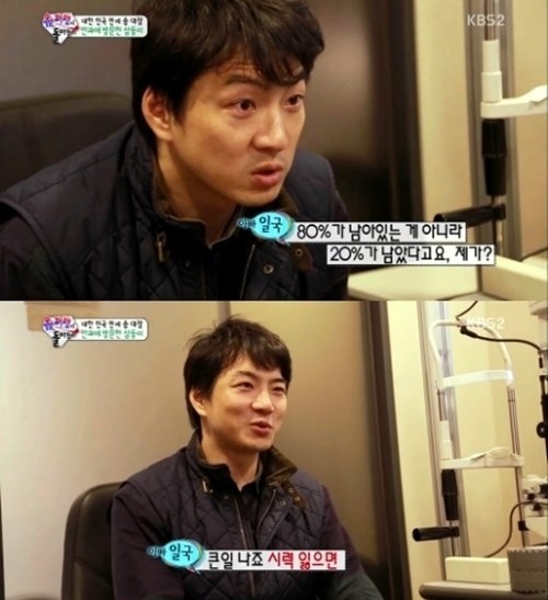 송일국은 "녹내장 초기 판정을 받은 적이 있다"며 "이렇게 심각한지 몰랐다"고 당황스러움을 감추지 못 했다. 그는 "시력 잃으면 애들은 어떡하냐"고 덧붙였다.