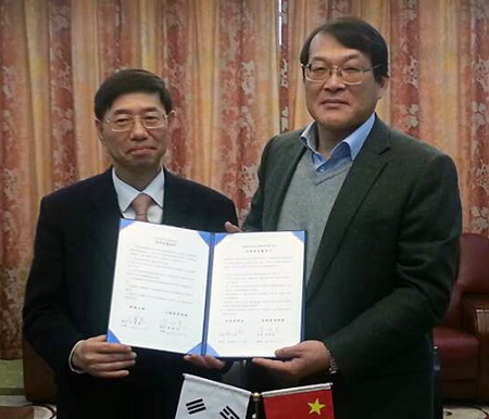 | ▲ 17일 중국 현지에서 진행된 '자매결연 협정식'에서 구기헌 상명대 총장(왼쪽)과 진패걸 상해체육학원 총장이 기념사진을 촬영하고 있다. | ||