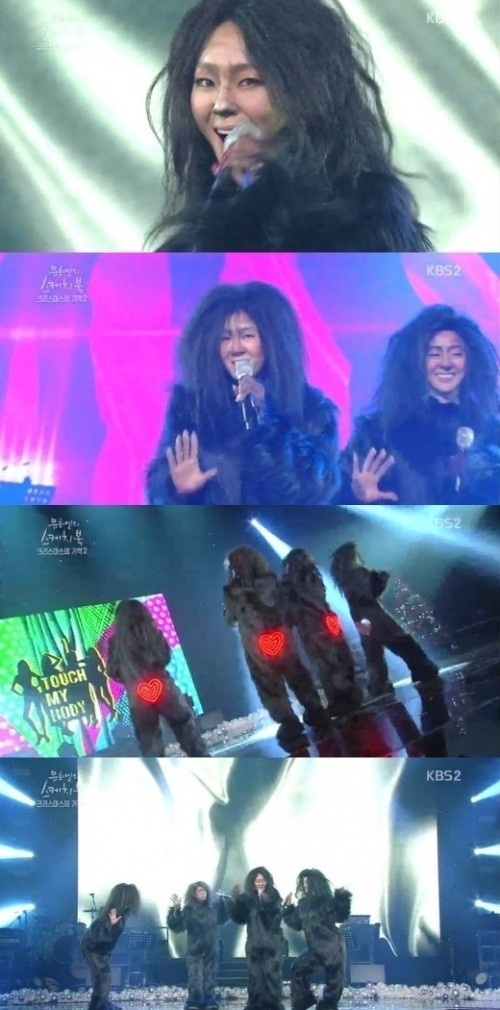 특히 혹성탈출 유인원 모습을 한 채 '터치 마이 바디'를 불렀고 엉덩이에는 하트 모양 불빛을 달아 웃음을 자아냈다.
