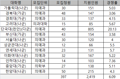 이들 대학 중 단국대(천안) 의예과의 경우 40명 모집에 805명이 지원해 20.13대 1을 기록해 가장 높은 경쟁률을 보였다.