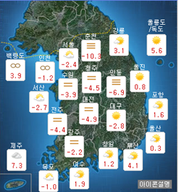 이날 6시 현재 서울 영하 3.1도, 인천 영하 1.7도, 수원 영하 5.8도, 대전 영하 6.2도, 광주 영하 2.9도, 대구 영하 2.4도, 부산 3.1도 등을 기록하고 있다.