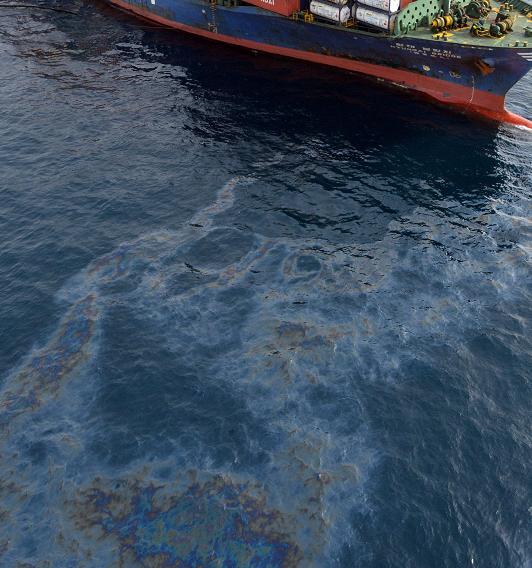 | ▲ 28일 부산 영도구 태종대 남서쪽 7.4마일 해상에서 모래채취선과 컨테이너선가 충돌하는 사고가 발생한 가운데 선체 파공으로 기름이 대량으로 유출, 기름띠를 형성하고 있다. /사진=뉴시스 | ||