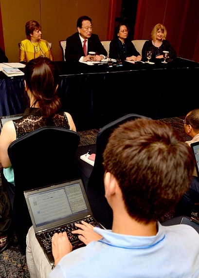 | ▲ 지난 8월4일 서울 중구 롯데호텔 서울점에서 열린 '제2차 차세대 여성 글로벌 파트너십 세계대회' 기자간담회에서 홍승용 덕성여대 총장(왼쪽 두번째)이 에볼라 논란에 대한 취재진의 질문에 답변을 하고 있다. /사진=뉴시스 | ||