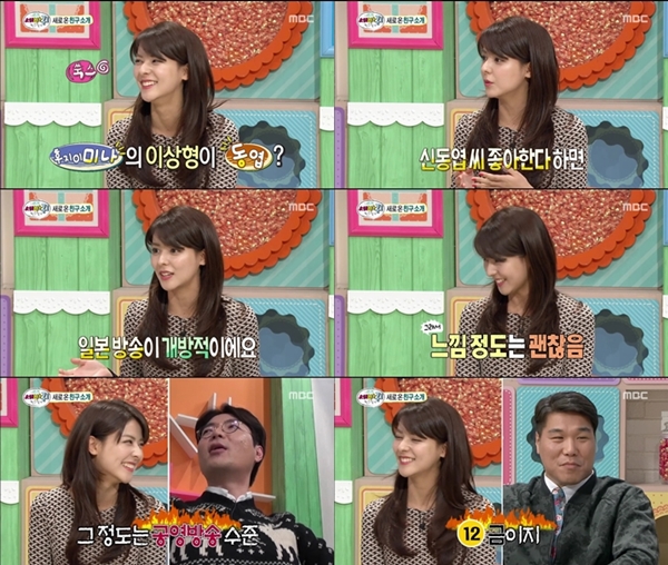 후지이 미나는 이날 방송에서 “신동엽이 이상형이다”라고 고백했다. 이 이야기를 들은 게스트들이 “신동엽은 19금 개그를 많이 한다. 그래도 괜찮나”라고 묻자 “신동엽을 좋아한다고 하면 모두 똑같이 물어본다”며 “일본은 방송도 개방적이라 나쁘지 않다”고 말해 웃음을 자아냈다.