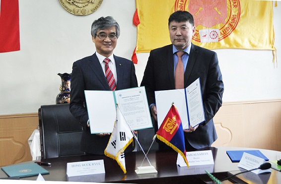 | ▲ 6일 몽골 현지에서 진행된 '교육협력 협약식'에서 홍덕률 대구사이버대 총장(왼쪽)과 바이갈사이한 울란바토르시립대학교 총장이 기념사진을 촬영하고 있다. | ||