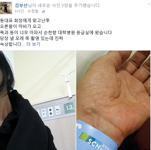 김부선씨는 자신의 페이스북을 통해 "동대표 회장에게 맞고 난 후 오른팔이 마비가 오고 목과 등이 너무 아파서 대학병원 응급실에 왔다. 당장 낼모레 쭉 촬영 있는데 진짜 속상하다"는 글과 함께 병원에서 치료를 받고 있는 모습이 담긴 사진을 게재했다.