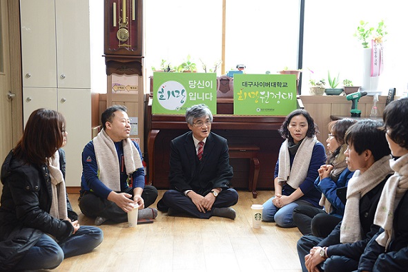 | ▲ 지난해 12월 경기 안산의 한 요양원을 찾은 홍덕률 대구사이버대 총장(가운데)이 재학생들과 함께 이야기를 나누고 있다. | ||
