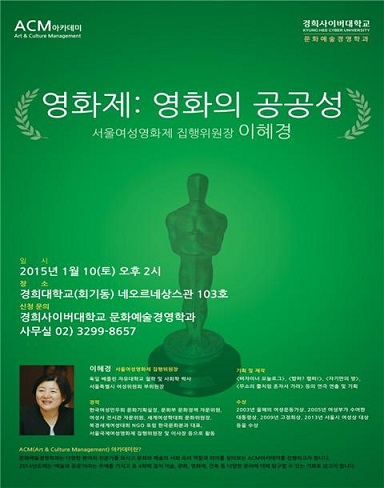 [미디어펜=류용환 기자] 경희사이버대학교는 서울 동대문구 경희대 네오르네상스관에서 '영화제:영화의 공공성'을 주제로 '2014 ACM Academy' 행사를 10일 개최한다.
