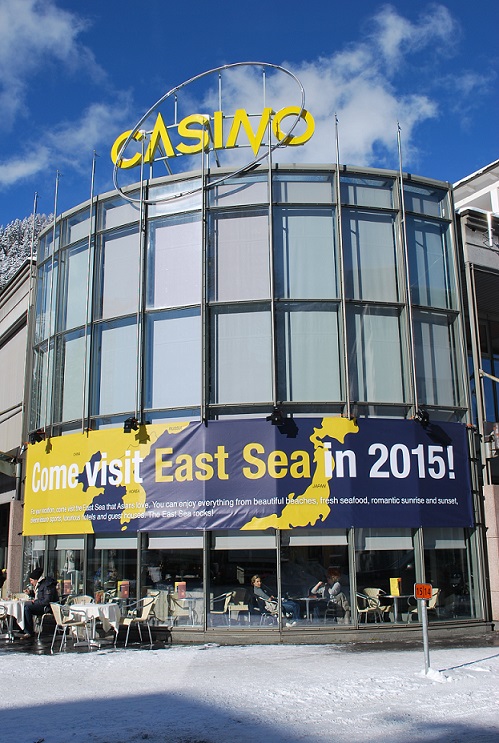 '2015년 동해로 놀러오세요'라는 내용을 담은 이번 광고는 가로 10m 세로 2m 크기로 다보스 포럼이 열리는 중심 거리에 설치됐다.