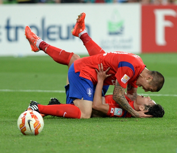 | ▲ 22일 오후(현지시각) 호주 멜버른 렉탱귤러 스타디움에서 열린 2015 호주 아시안컵 8강전 대한민국과 우즈베키스탄의 경기에서 한국 손흥민이 연장 후반 골을 넣고 차두리와 기뻐하고 있다. / 사진=뉴시스 | ||