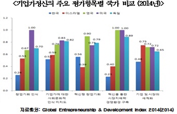 또 ‘창업기회 인식’ 지표는 0.26포인트로 4개국 평균 0.725 포인트에 비해 역시 현저히 낮았다. 이밖에 기업가에 대한 사회문화적 인식·지지도, 혁신형 창업 기회, 기업·시장의 세계화 항목도 0.4에서 0.5포인트 대로 비교적 낮은 것으로 나타났다.