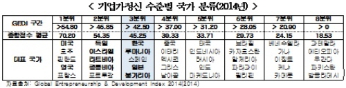 세계기업가정신발전기구가 발표한 2014년 글로벌기업가정신지수(GEDI)*에 따르면 우리나라는 120개국 중 32위를 기록해 상위 27%에 해당되는 것으로 나타났다. 2012년 79개국 중 26위로 상위 33%, 2013년 118개국 중 37위로 상위 31%에 속한데 비해 소폭 상승한 결과다.