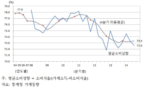 특히 국내 가계의 소비성향은 2011년 이후 지속적으로 하락하고 있는데 이는 부동산 시장의 약세, 가계부채의 증가와 맞물려 단순히 과도한 심리위축으로 평가하기 어려운 상황에 있다.