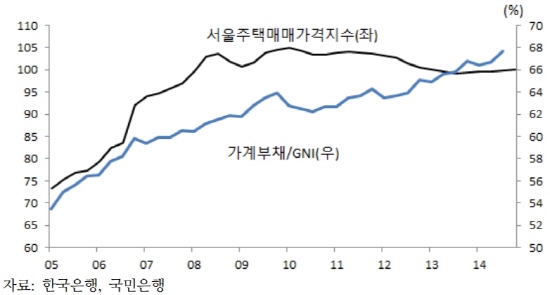 | ▲ GNI 대비 가계부채 비율과 서울주택매매가격 | ||