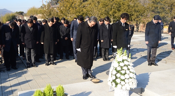 김무성 대표는 이날 김태호 최고위원, 이군현 사무총장, 박대출 대변인, 김학용 비서실장, 홍태용 김해갑당협위원장, 김해 도·시의원 등과 묘역에서 헌화 분향한 뒤 묵념했다.