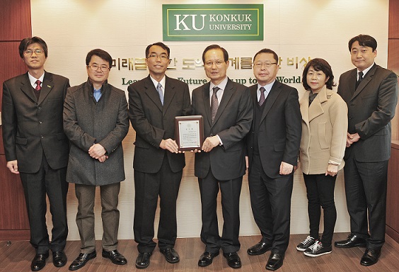 | ▲ 지난 13일 서울 광진구 건국대 행정관에서 열린 '장학금 기부식'에서 건국대 송희영 총장(가운데)과 융합인재학부 교수들이 기념사진을 촬영하고 있다. | ||