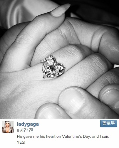 레이디 가가는 지난 17일 자신의 인스타그램을 통해 “그가 발렌타인 데이에 자신의 마음을 내게 주었고 나는 ‘YES’라고 답했다”며 자신의 손가락에 끼어진 반지 사진을 게재했다.