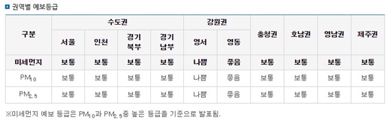 전일 축적된 미세먼지가 점차 해소됨에 따라 미세먼지 일평균 농도는 강원도를 제외한 전 권역이 ‘보통’이 되겠다.