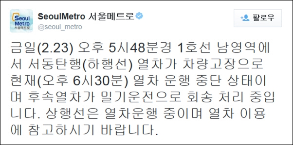 1호선 전동차 오후 5시 48분 남영역서 멈춰... 40분간 운행 지연