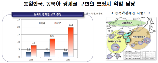 [미디어펜=온라인뮤스팀] 2050년 동북아경제권의 경제규모(GDP)는 19조8000억 달러에 달할 전망이다. 동북아경제권은 통일한국·일본·중국·동북3성·극동러시아·몽골 등이다.