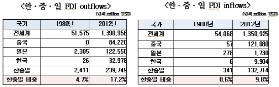 한편 해외투자 부문에 있어서도 한·중·일 세 나라가 세계 투자규모에서 차지하는 비중이 높아지고 있는 것으로 나타났다. 한·중·일의 해외직접투자 비중(FDI Outflow)은 1980년 4.7%에서 2012년 17.2%로 네 배 가량 증가했다. 이에 대해 권 원장은 양적완화 정책을 추진하면서 일본의 대규모 해외직접투자가 2010년 이후 늘어난 결과라고 설명했다. 또 한·중·일에 대한 외국인투자의 전 세계 비중 역시 1980년 0.6%에서 2012년 9.8%로 증가한 것으로 나타났다. 여기에는 2000년대 들어 대(對)중국 투자가 급증했기 때문이라고 권 원장은 밝혔다.