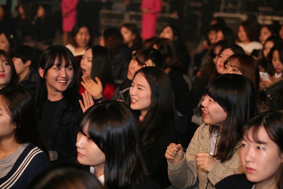 | ▲ 24일 서울 잠실 실내체육관에서 열린 '성신여대 2015학년도 신입생 입학생 및 환영회'에서 학생들이 축하 공연을 보고 있다. | ||