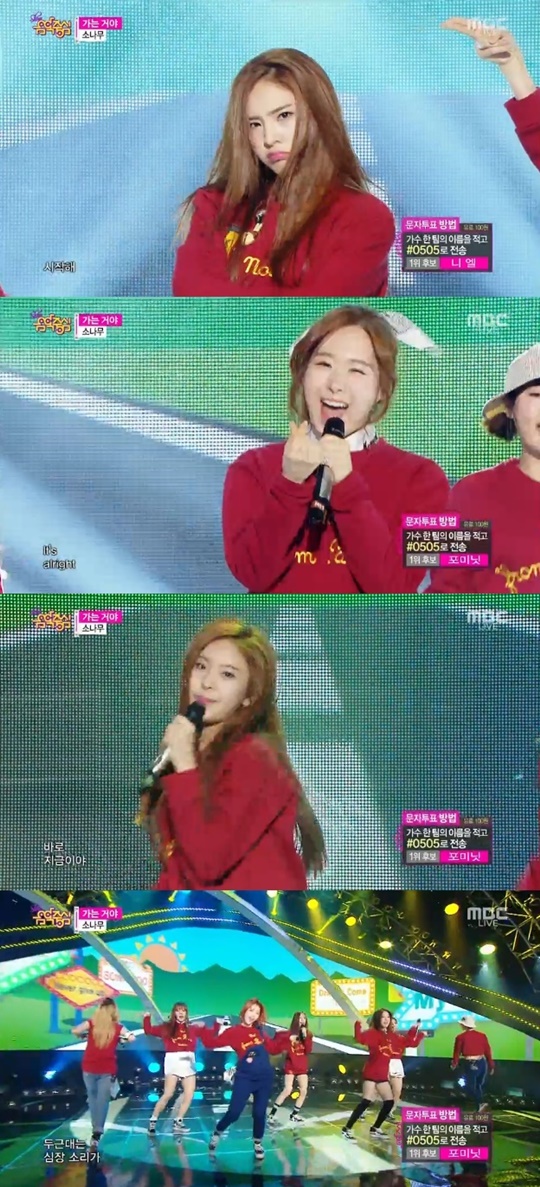 28일 오후 배우 김소현, 샤이니 민호, 틴탑 니엘의 진행으로 방송된 MBC 음악방송 '쇼!음악중심'(음악중심)에서는 소나무가 '가는거야'를 열창했다.
