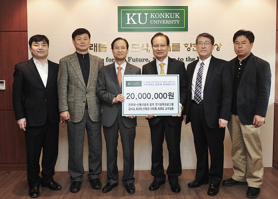 [미디어펜=류용환 기자] 건국대학교는 전기공학과와 융합인재학부 교수진이 ‘건국대-중국 산둥이공대학간 전기공학 합작학과' 학생들을 위한 장학기금으로 2000만원을 기부했다고 4일 밝혔다.