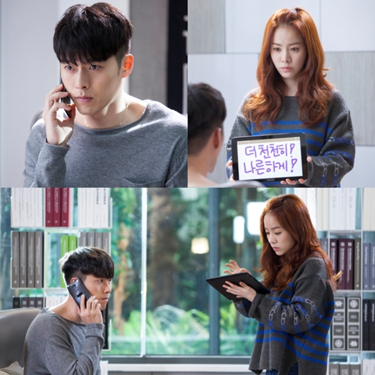 현빈은 휴대전화로 누군가에게 전화를 거는 듯한 모습이며 한지민은 그런 현빈 앞에서 '더 천천히', '나른하게'라는 글이 쓰인 태블릿PC를 든 채 현빈을 바라보고 있다.