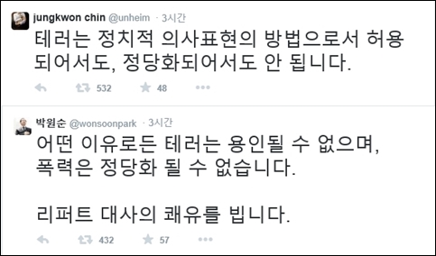 박원순 서울시장 역시 김 씨에 대한 비판과 동시에 리퍼트 대사의 빠른 쾌유를 기원했다. 박 시장은 트위터에 “어떤 이유로든 테러는 용인될 수 없으며 폭력은 정당화될 수 없다. 리퍼트 대사의 쾌유를 빕니다”라는 글을 올려 안타까운 마음을 전했다.