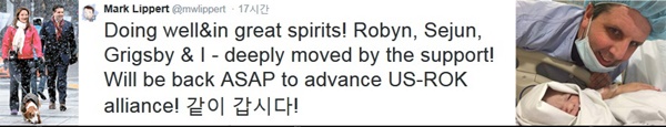 | ▲ 리퍼트 주한미국 대사가 트윗에 병상에서 걱정하는 한국인에게 전한 말, 그리고 서울에서 산책하는 장면과 지난 1월 20일 2세 '세준' 출산을 알린 사진/출처=리퍼트대사 트윗 | ||