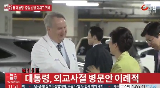 | ▲ 9일 박 대통령은 오전 중동 4개국 순방을 마치고 성남공항을 통해 귀국한 직후 흉기 습격을 당해 서울 신촌세브란스 병원에 입원중인 마크 리퍼트 주한 미국대사를 찾았다/사진=TV조선 캡쳐 | ||