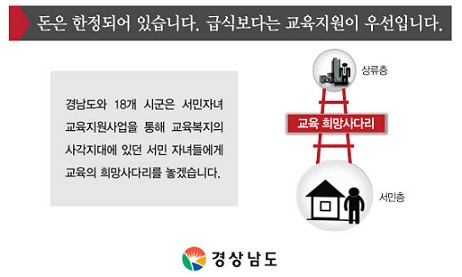 11일 경남도에 따르면 지난 9일 경남 초·중학교 무상급식 지원 예산 643억원을 서민자녀 교육지원 사업으로 재편성해 바우처(418억원), 맞춤형 교육(159억원), 교육여건 개선(66억원) 등에 투입하겠다고 발표했다.