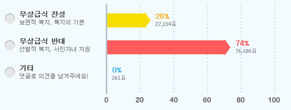 '김**' 아이디의 네티즌은 "무상 교육과 무상 급식을 왜 같이 생각하는지 모르겠다. 무상급식은 할 필요가 없다고 생각한다. 급식비를 못내는 아이들에게 급식비 및 다른 지원을 해주는것이 더 올바른게 아닌가 생각된다. 밥만 먹여준다고 서민이 서민이 아닌게 되지는 않는다"고 말했다