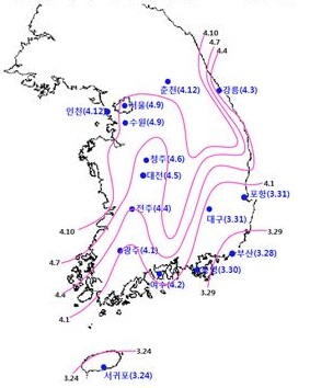 | ▲ 2015년 벚꽃 개화시기 현황 분포도. /자료=기상청 | ||