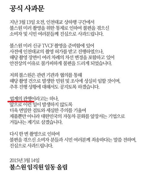 | ▲ '인천대교' 무단 도로점거 관련 '불스원' 사과문. | ||