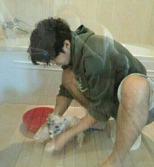 공개된 사진에는 욕실에서 강아지를 목욕시키고 있는 윤계상의 모습이 담겨져 있다. 그런데 문제는 유리창에 이 모습을 촬영하는 듯한 반나체의 여성의 모습이 비쳐지고 있기 때문이다.