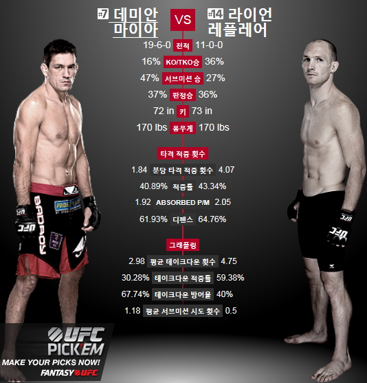 [미디어펜=임창규 기자] 11승 무패의 UFC 웰터급 신예 강자 라이언 라플래어(31·미국)와 19승 6패의 베테랑 데미안 마이아(37· 브라질)가 맞붙는다.