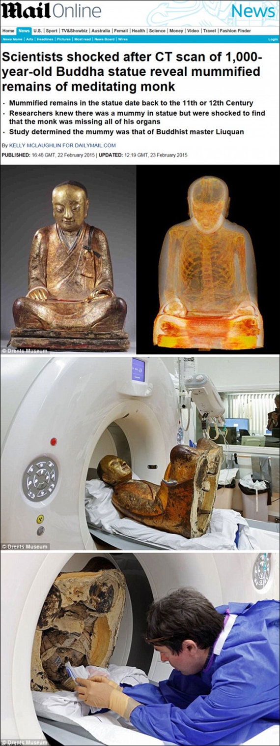 네덜란드 아메르푸르트의 의학센터 전문가들은 불상 안에 무엇이 있는지 CT촬영 및 불상 내시경 검사, 미라 DNA 검사 등을 통해 정밀 조사한 결과 내부 안에서 사람의 뼈대를 확인했으며 1~12세기 무렵인 1050~1150년 사망한 것으로 추정되는 수도승 미라를 확인했다.