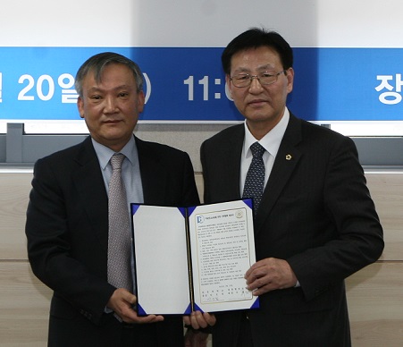 | ▲ 지난 2일 서울 성북구 한성대 학송관에서 진행된 '학술정보교류 협약식'에서 강신일 한성대 총장(왼쪽)과 이용만 대한행정사협회 회장이 기념사진을 쵤영하고 있다. | ||