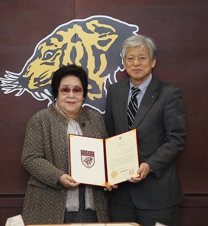 | ▲ 23일 서울 성북구 고려대에서 진행된 '장학기금 전달식'에서 전윤자씨(왼쪽)와 염재호 고려대 총장이 기념사진을 촬영하고 있다. | ||
