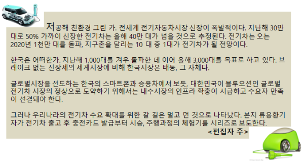그러나 한없는 생각의 날개는 전기차를 받는 순간 접어야 한다. . 주유없이 차가 움직이지 않듯이 충전없는 전기차는 무용지물이다. 전기차는 출고 때 충전카드를 함께 주지않는다. 주행자가 발급절차를 밟아 카드를 발급받아야 한다. 전기차 발급과정에서 운전자는 국민의 눈높이를 맞추지 못하는 '행정편의'의 불편한 진실을 또 맞봐야 한다.