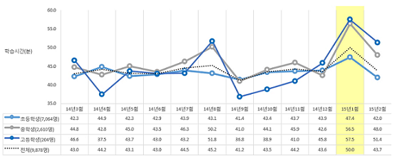 중학생은 45.9분, 고교생은 44.8분으로 초등학생의 영어학습 시간은 중·고교생과 비슷한 수준을 기록했다.