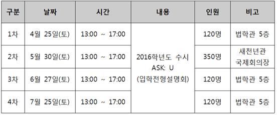 | ▲ 건국대 2016학년도 수시 입학전형설명회 일정 및 장소. | ||